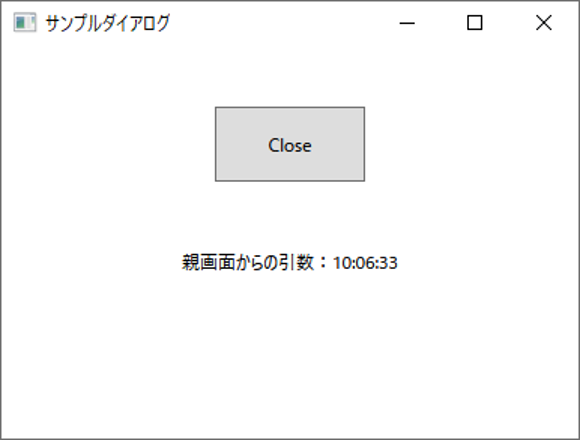 - ダイアログの「Close」ボタン押下でダイアログを閉じ、親画面に実行結果(現在時刻)を返します。