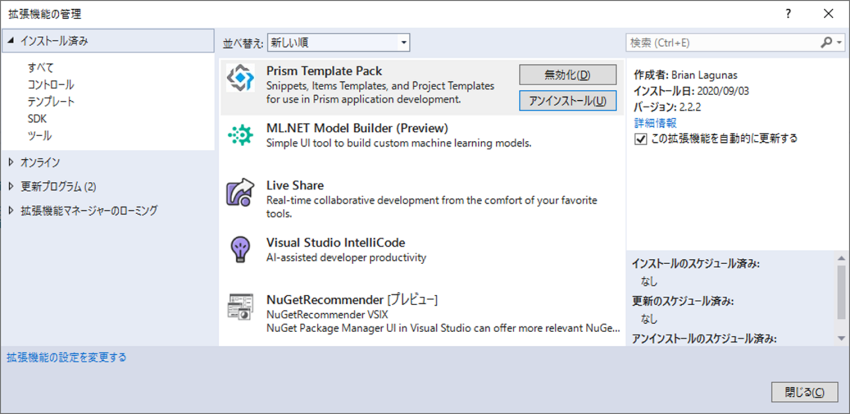 Visual Studio の Marketplace から、Prism Template Pack をインストール