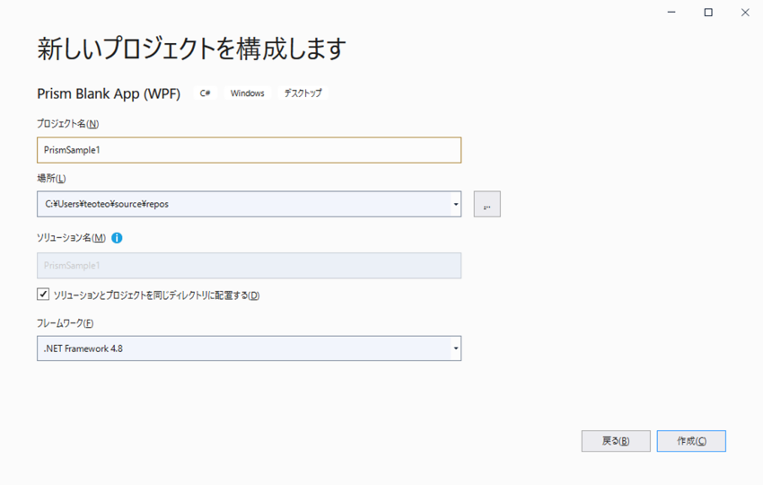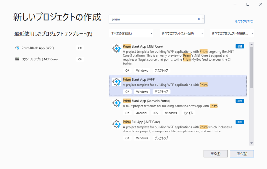 Prism Blank App(WPF) を選択してプロジェクトを作成
